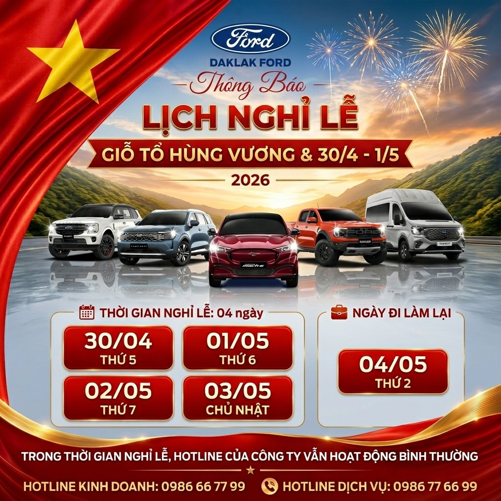 Nhân dịp Giỗ Tổ Hùng Vương, kỷ niệm ngày Giải phóng miền Nam (30/4) và Quốc tế Lao động (1/5), DakLak Ford trân trọng gửi đến Quý khách hàng và Quý đối tác thông tin lịch nghỉ lễ như sau: